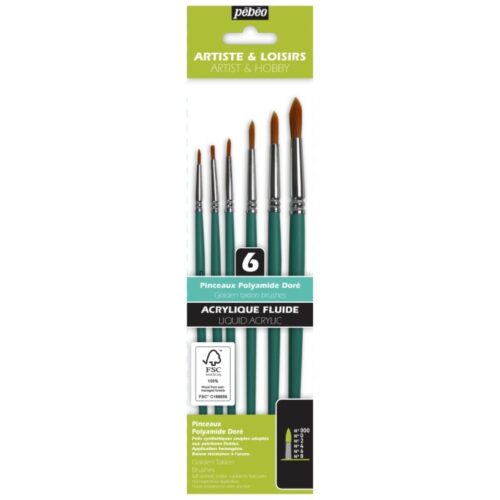 Pebeo Brush Set of 6 – Round.  Most suitable for art, hobby and craft projects including watercolour, acrylic, gouache and ink.